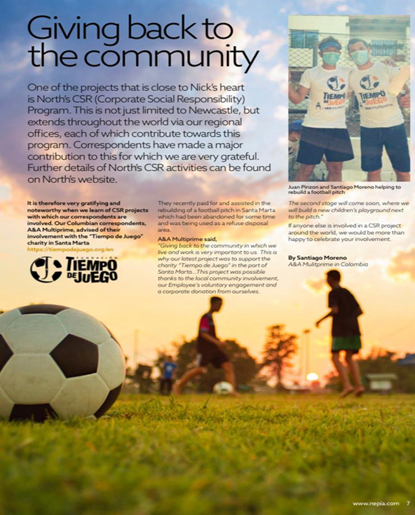 A&A Multiprime is proud to see our social initiatives highlighted by one of our clients, NorthStandard. In their CSR program, they recognized our involvement with Fundación Tiempo de Juego in Santa Marta, where we contributed to the rebuilding of a football pitch and the construction of a playground for children in vulnerable communities. We are grateful for this acknowledgment, which reinforces our belief in giving back to the communities where we live and work.